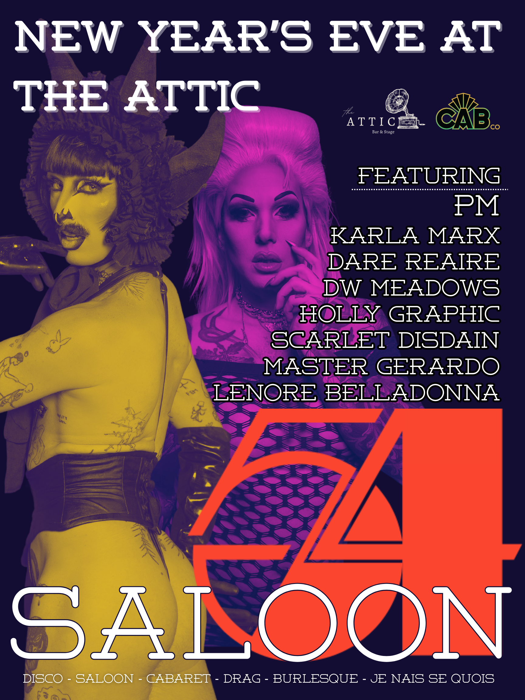 This New Years Eve, The Attic transforms into SAL❍❍N 54 - a dazzling mash-up of disco decadence, cabaret heat, queer glamour, and Western grit
